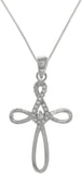 This Infinity Cross necklace combines the beauty of the Celtic Infinity knot with an elegantly shaped Cross design. Multiple pave-set clear cubic zirconia stones adorn this brilliant piece. This pendant is crafted of .925 Sterling Silver with a highly polished rhodium plated finish to resist tarnish. Pendant is strung on an 18 inch sterling silver box chain that secures with a spring ring clasp.