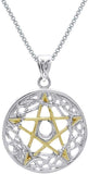 Crafted of highly polished .925 Sterling Silver with gold-plated highlights, this necklace showcases a pentacle star surrounded by a Celtic knot work border. This Pentacle is further enhanced by a high thickness of polished gold-plating to make the center star stand out and be noticed. The pendant comes with an 18 inch sterling silver box chain that secures with a spring ring clasp. Peter Stone© Jewelry Designs are exclusive and protected by Copyright Laws.
